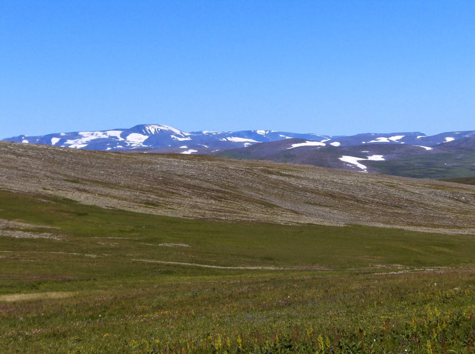 Красиво очень – горушка со снежниками, голубое небо, ручеек журчит и никаких посторонних звуков.