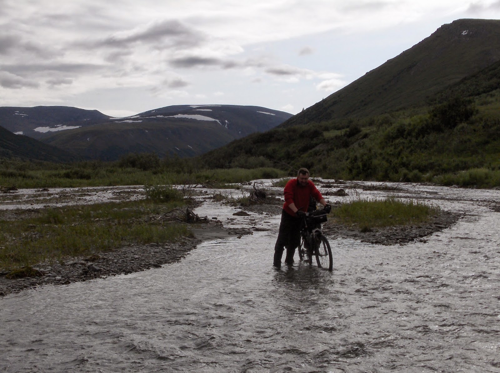 так, чтобы глубоко, но течение с ног сбивает. Пришлось искать, где помельче и потише. Бродов будет еще много, но этот первый, потому рюкзаки сняли, велосипеды переносили на руках. Потом, как правило, просто катили наших коней по дну, порой погружаясь почти по руль. (Ремонт велосипеда по окончании маршрута мне обошелся в половину его изначальной стоимости.).