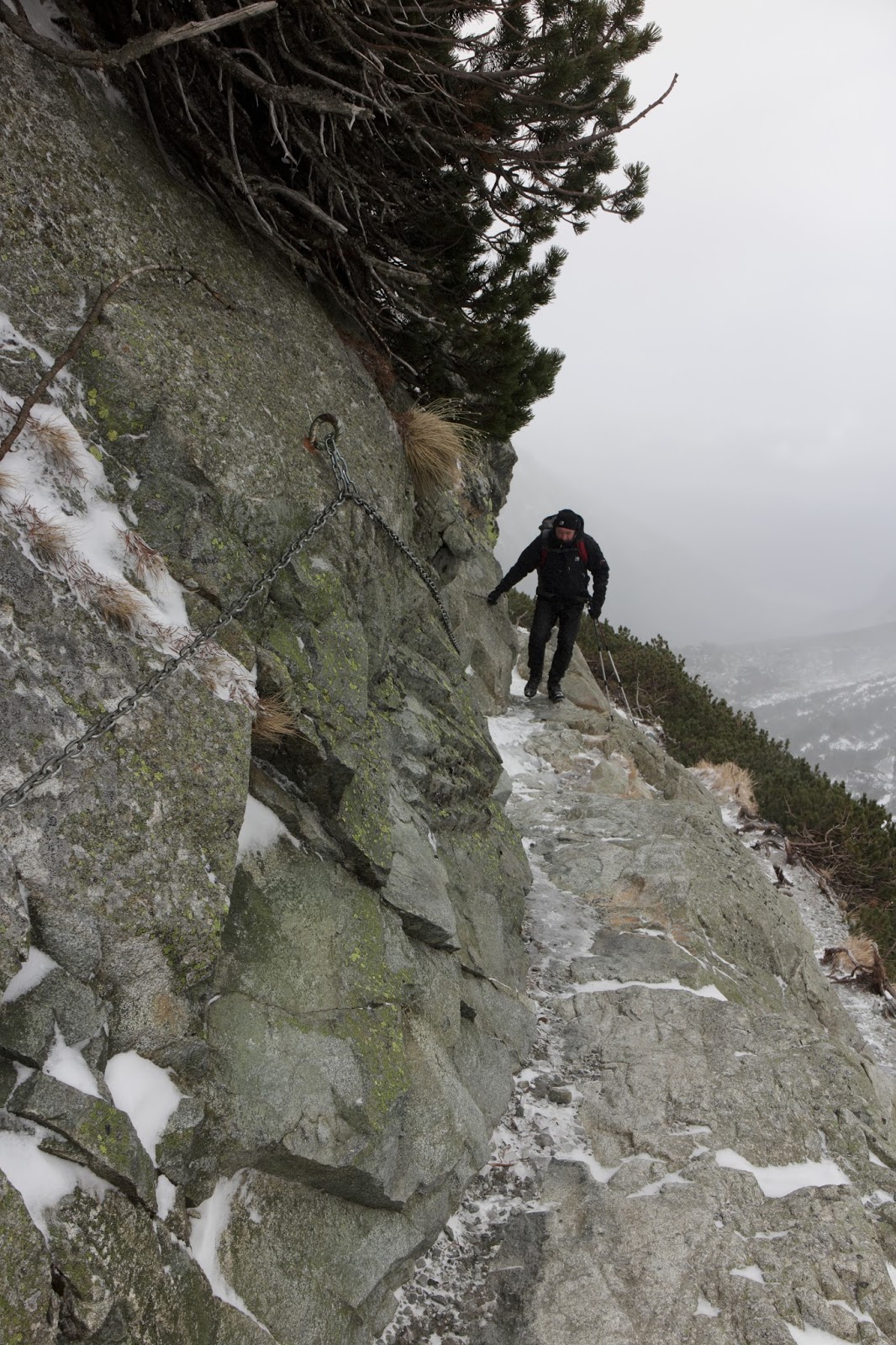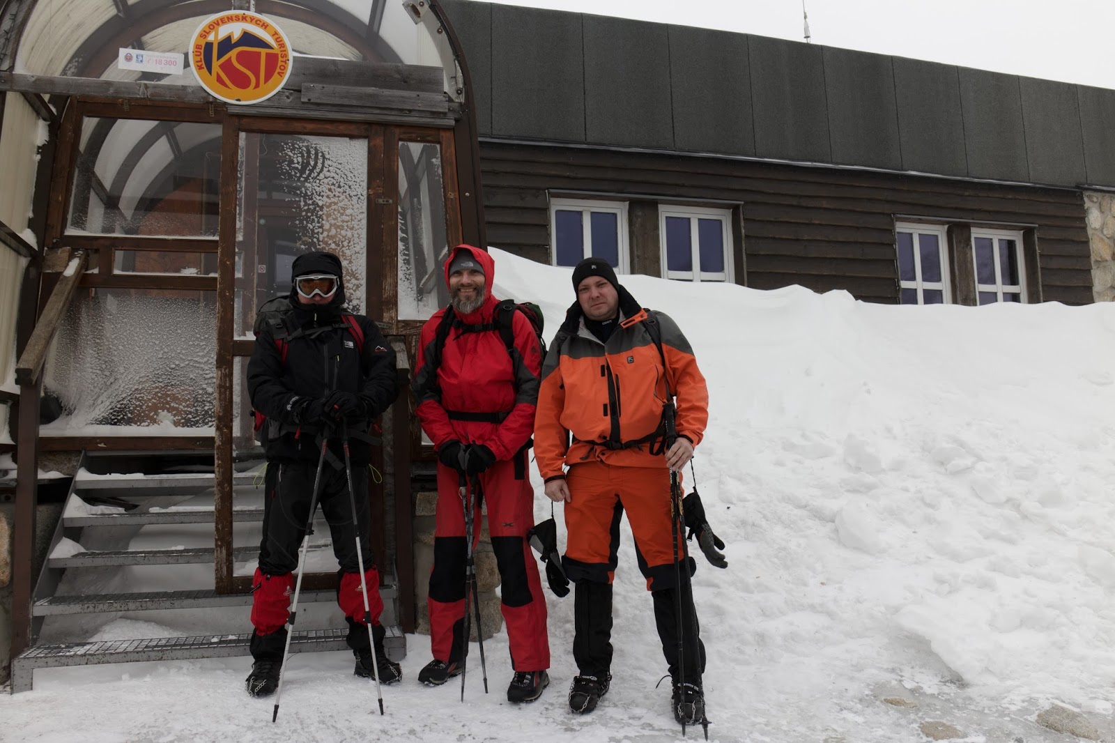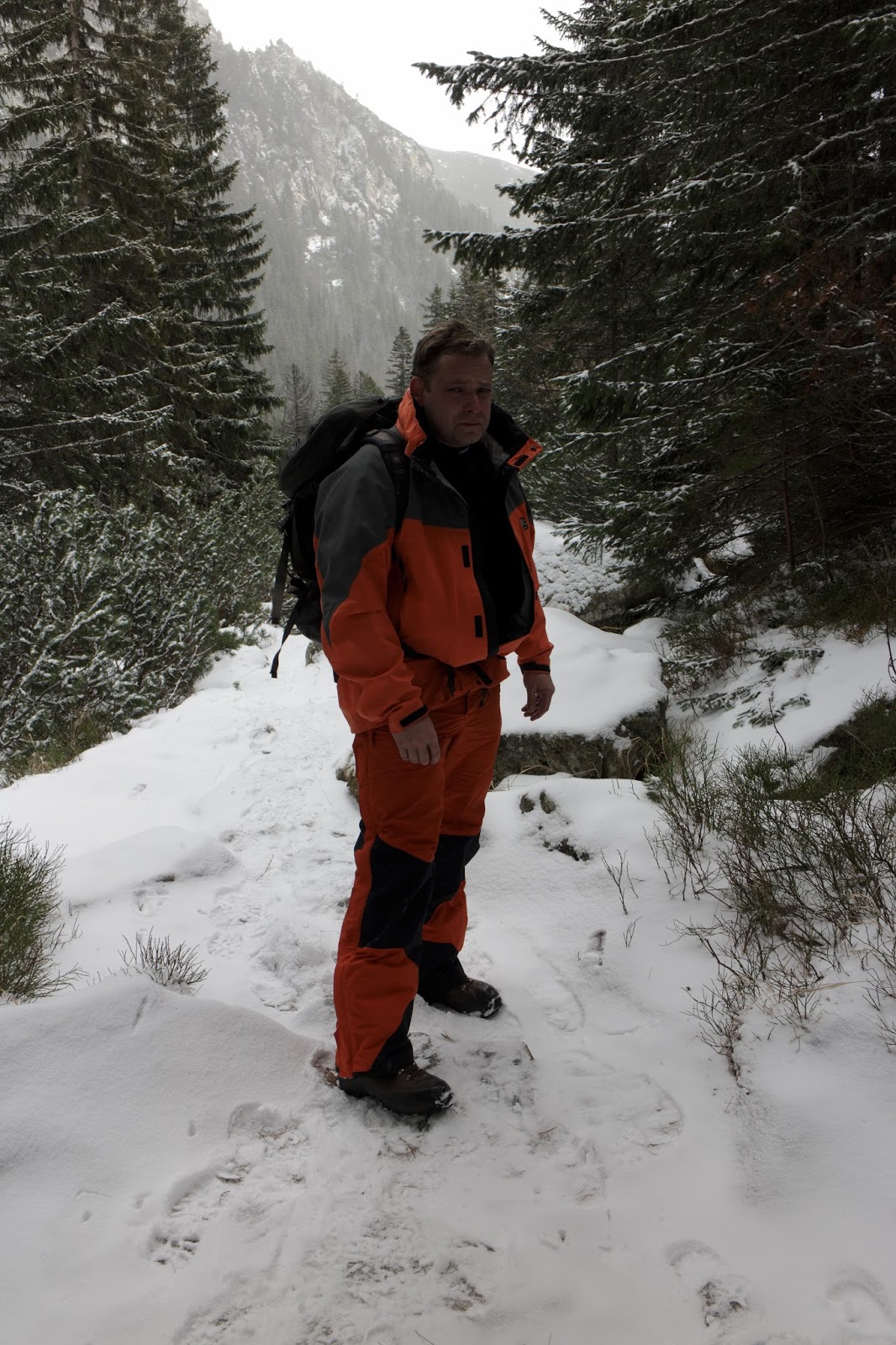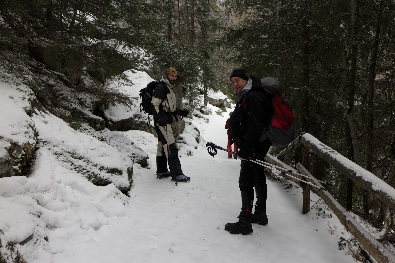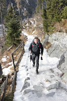 Пока другие поднимались, мы с Вацлавом попив супа с чаем пошли выше. Нашли склон и начали зачем-то на него подниматься. Склон стал круче, одели кошки и попёрли дальше… Когда уже стоял только на передних зубъях в твёрдом фирне, догадался посмотреть вниз. Там было куда лететь. Вслух усомнился в здравости происходящего. Вацлав согласился и мы спустились. На этом альпинистская часть нашего похода была завершена и мы поспешили в хату на встречу с Юрой и Кириллом. Юра молодец. Всё-таки дошёл.