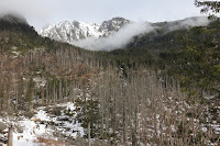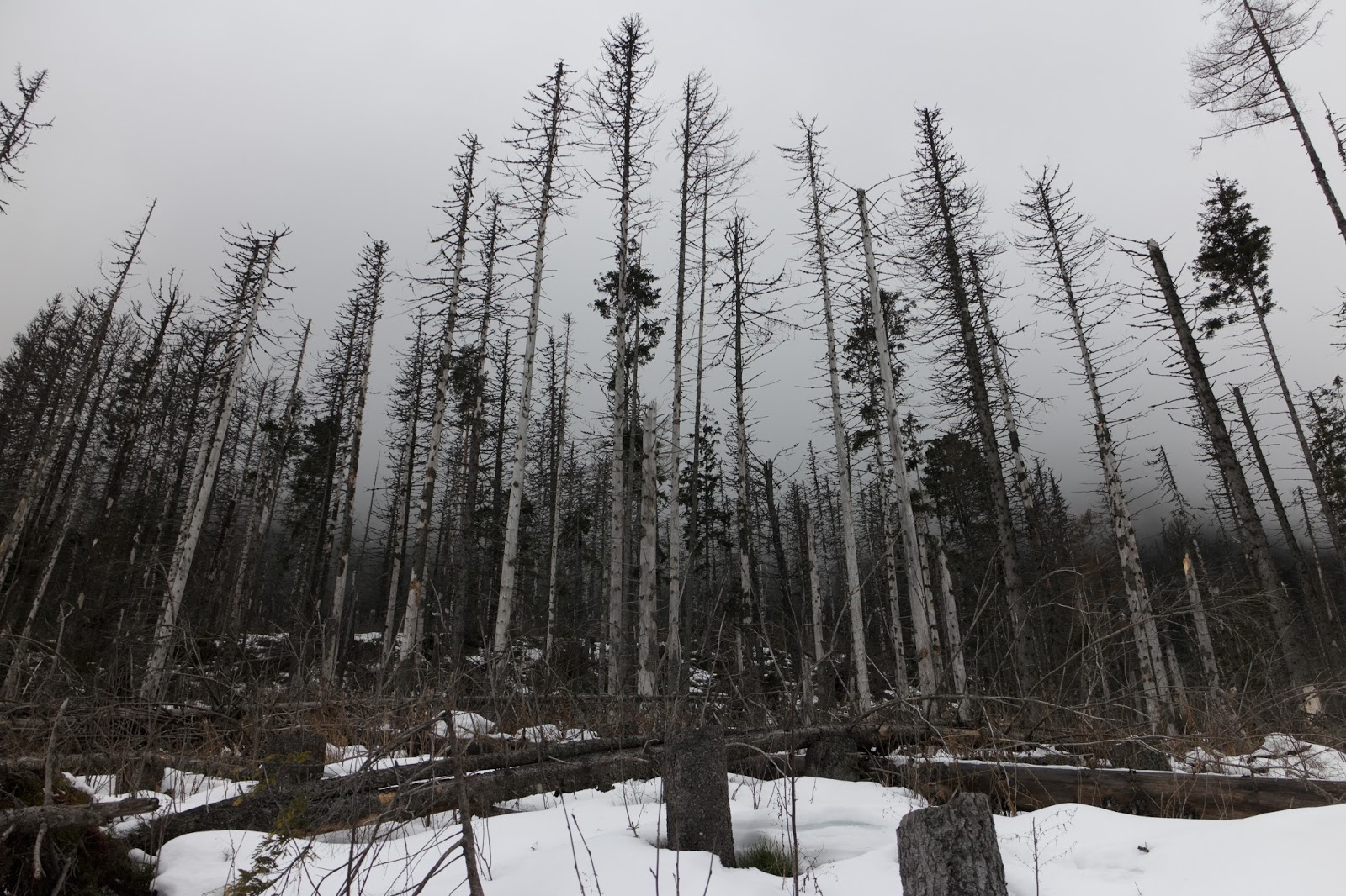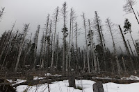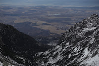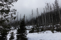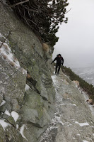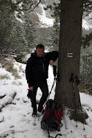 Лес быстро кончился, начался сильный ветер. Чем выше тем сильнее. Мы с Вацлавом сильно убежали вперёд. На взлёте перед хатой Вацлав решил пойти на краешек посмотреть где Юра с Кириллом. Стоять было трудно, сдувало порывами ветра с жёсткой снежной крупой, которая больно шлифовала кожу на лице. Вернулся Вацлав только благодаря «мордохлёсту» за который он удержался от полёта с ветром. Трудно переоценить значение бороды и лыжных очков в такую погоду! |