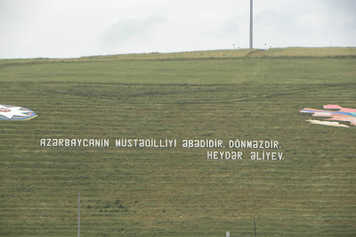 Никогда еще не приходилось бывать в столь авторитарном государстве. Я, конечно, родился и вырос на “одной шестой части суши”, но, если сравнить, Владимир Ильич был скромнягой. Уж, не знаю сколько тут истиной любви и памяти народной, но Азербайджан – это страна имени Гейдара Алиева. Парки Гейдара Алиева, центры Гейдара Алиева, конгрессхолы Гейдара Алиева, памятники Гейдару Алиеву, площади, скверы, проспекты, цитаты в полсклона горы… Рядом с Олимпийским центром, в котором я ночевал, одно из подобных посвящений бывшему лидеру – центр, сквер, монумент.