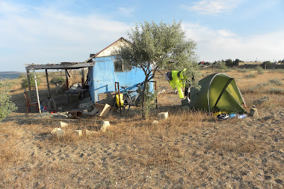 Доехал до Гобустана. Выяснил, где можно выехать на пляж. Популярное место отдыха только готовится к сезону. Четверка молодых спасателей чинят моторку, вешают плакаты и зовут пить чай. Чаю выпил, палатку поставил и (впервые!) в Каспийском море искупался. Первую, правда дохлую, змею увидел через пять минут после фразы: